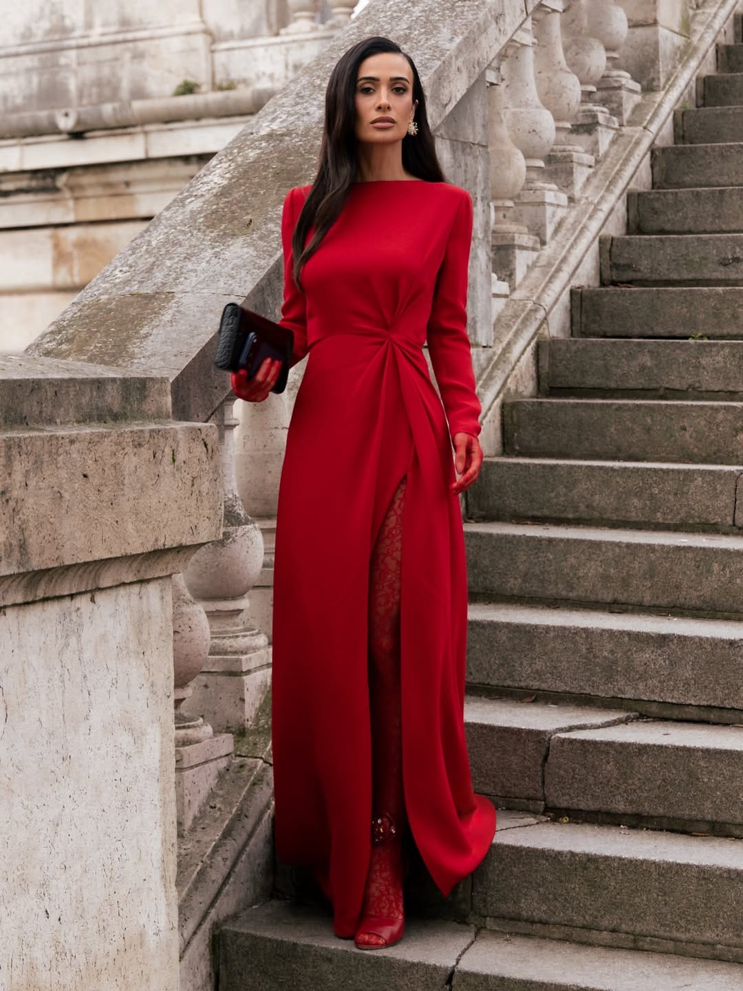 The long sleeves extend the sense of control and polish. They balance the intensity of the color, ensuring the look remains sophisticated rather than theatrical. Coverage here does not diminish allure. Instead, it sharpens it. The neckline remains clean and composed, directing attention toward posture, expression, and the subtle glow of carefully chosen jewelry. Earrings catch light with restraint, offering brilliance that complements rather than competes.