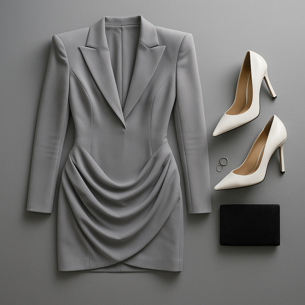“Create a flat lay composition inspired by a sophisticated gray tailored mini dress with structured shoulders and draped skirt detailing. Include sleek white pointed-toe stilettos, a minimalist rectangular black clutch, and a delicate silver ring set placed beside the bag for subtle shine. Background should be a muted gray gradient, mirroring the tone of the dress. Arrange the items with balance and precision, evoking a sense of power dressing and architectural elegance. No models, no text, only the fashion pieces styled flat.”