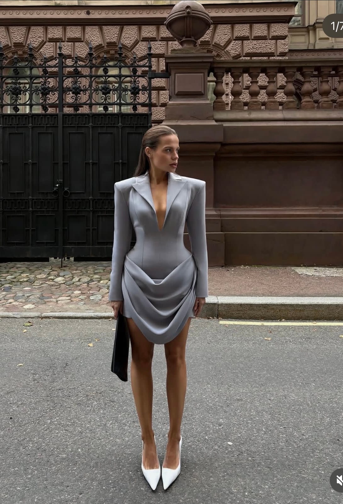 The centerpiece is a structured gray mini dress designed by saboniskristina. Its fitted bodice, defined shoulders, and plunging neckline carve out an undeniable statement of confidence. The power-shoulder tailoring borrows from the world of blazers, yet the sculptural draping at the hips softens that edge, introducing movement and fluidity. It’s a smart balance: the top speaks in the language of authority, while the bottom half creates softness and intrigue with layers of cascading folds.
