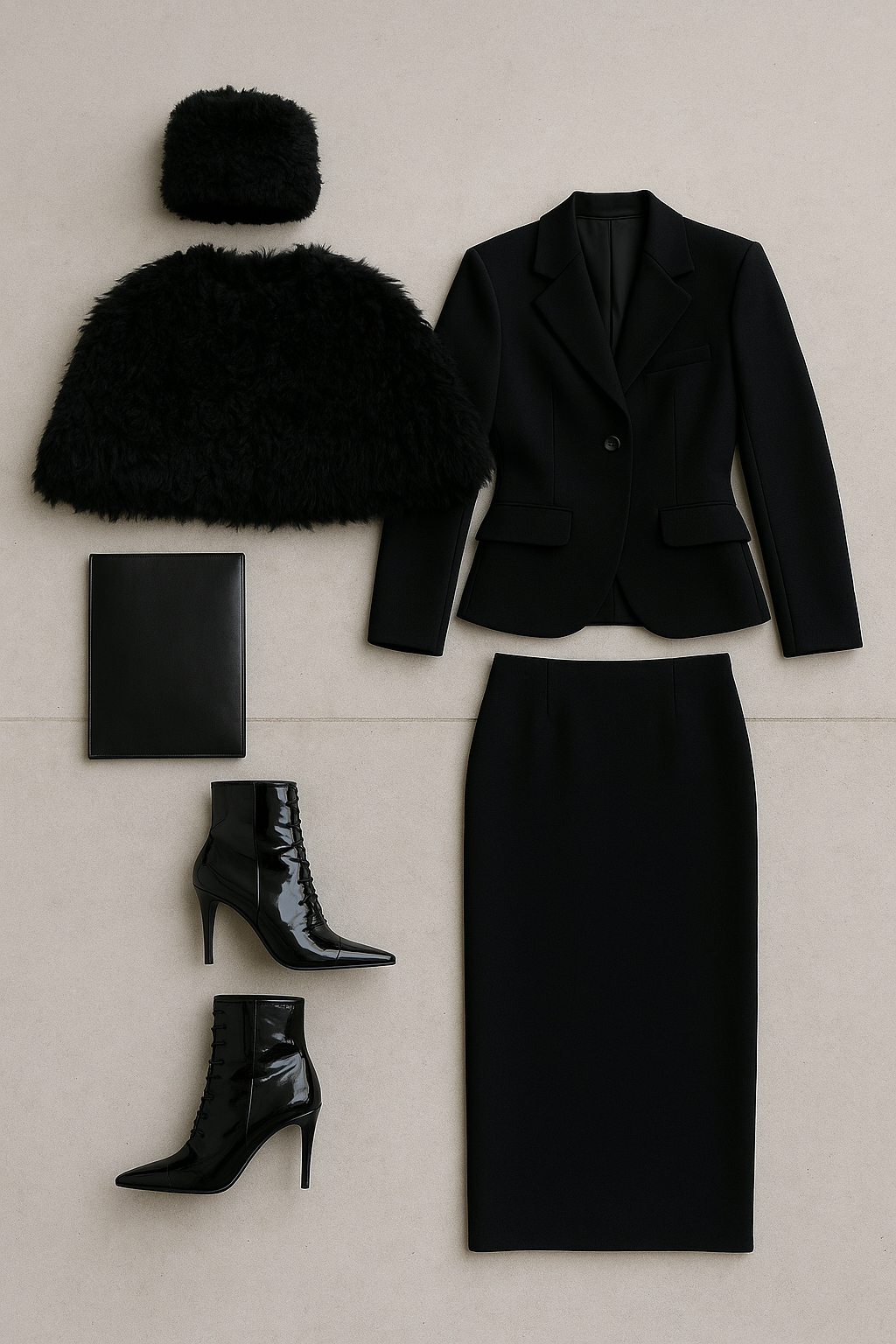 "A high-fashion flatlay featuring an all-black luxury winter ensemble inspired by couture styling. Include a textured black fur hat, a matching cropped fur cape, a structured tailored black blazer with sculpted shoulders, a long black pencil skirt, glossy pointed-toe ankle boots, and a sleek rectangular black clutch. Arrange the pieces neatly on a smooth neutral marble background with soft diffused lighting, giving an editorial Parisian mood."