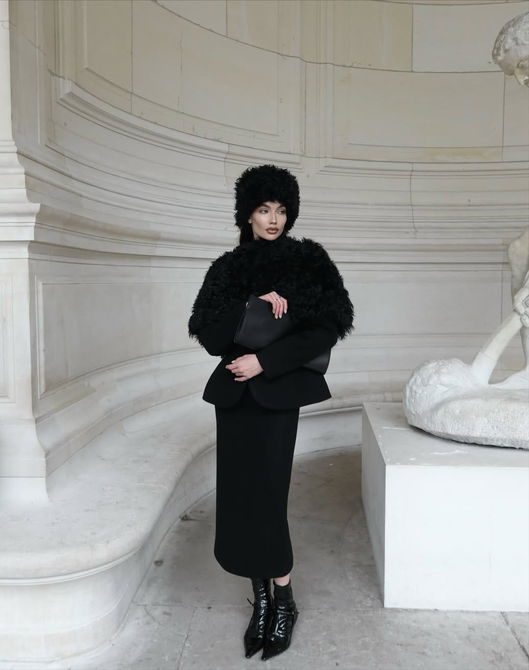 What makes this outfit stand out is how minimal and deliberate the accessories are. Yana carries a structured black clutch, a perfect continuation of the sleek lines in her outfit. The bag adds polish without drawing attention away from the main look. Her patent leather boots bring in a subtle shine that breaks the matte dominance of the cape and skirt. The pointed toes add sharpness and attitude, while the length of the boots balances the proportions beautifully. Everything feels cohesive, as if each item was chosen with a clear purpose.