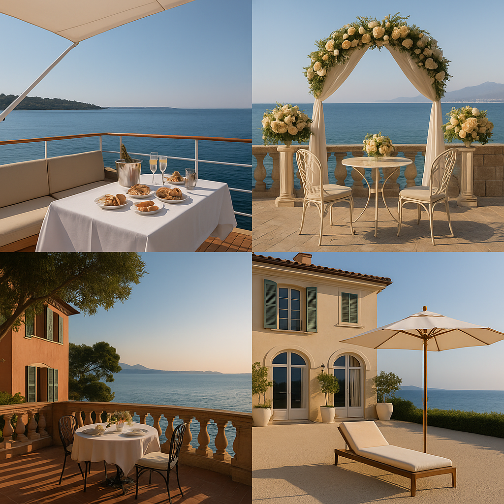 Each scene in this grid captures a mood of soft luxury and coastal elegance. Champagne flutes, sculpted florals, sunlit terraces, and villa charm come together to create the perfect backdrop for refined style. These aren’t just settings; they’re invitations to dress with purpose, move with ease, and let the atmosphere do the rest.
