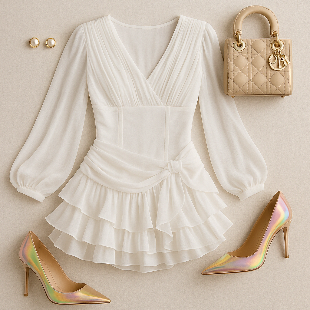 “A high-resolution flat lay of a white chiffon mini dress with long pleated sleeves, a V-neckline, and layered ruffle skirt, styled on a soft beige background. Include iridescent pointed-toe high heels, a beige Lady Dior mini handbag with gold hardware, and a pair of classic gold pearl stud earrings. The layout should be symmetrical, softly lit, and showcase the full outfit with clean, elegant styling. No shadows, no text, no model”