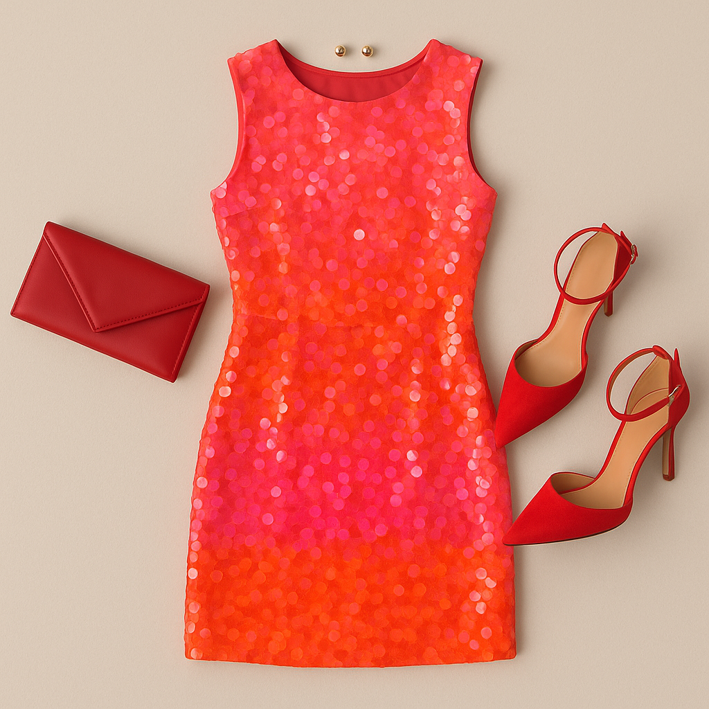“A flat lay composition of a glamorous ensemble featuring a sleeveless sequined mini dress in vibrant shades of hot pink and fiery orange, shimmering under soft light. Include a structured red clutch with sharp, angular lines, and a pair of pointed red heels with slim ankle straps. Add a pair of small gold earrings placed delicately near the neckline of the dress. Background should be minimal, in a neutral tone, to let the bold colors of the outfit shine. Arrange all items neatly and aesthetically, as if styled for a high-fashion editorial spread.”