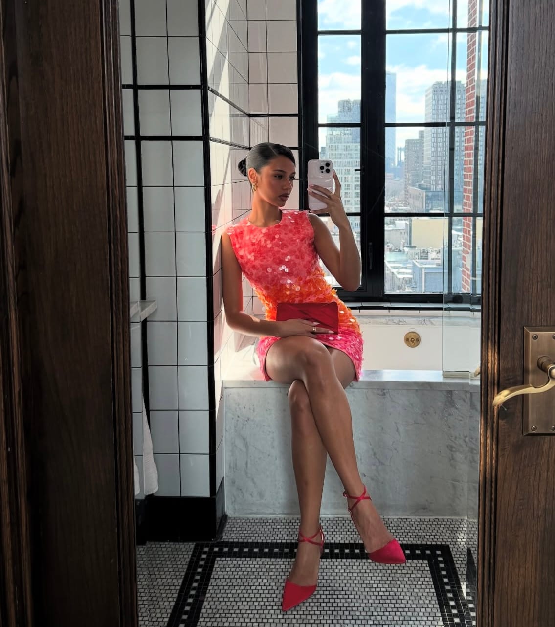 The accessories chosen speak to sharp precision. A structured red clutch in a clean, angular shape rests in her hands like a statement of intent, anchoring the shimmer of the dress with a solid pop of color. The pointed red heels, tied at the ankle with slim straps, extend that same energy downwards, creating a perfect visual echo between hand and foot. Together, they frame the sequined explosion of the dress, almost acting as exclamation marks to an already daring sentence. It’s styling that shows control—nothing feels accidental, every piece has purpose.