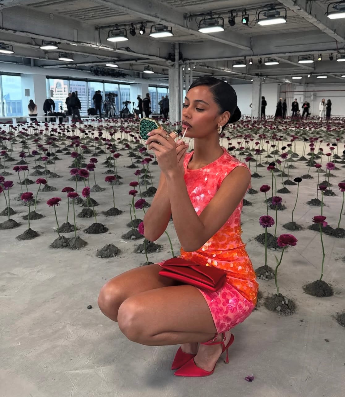 The setting deepens the impact of the look. Surrounded by rows of singular flowers planted in soil mounds, Jamilla appears as though she is part of a curated installation. The deep violets and magentas of the blooms reflect back the pink tones of her dress, while the clean rows mirror the discipline of her styling. When she pauses to adjust her clutch or applies lipstick in the middle of the floral field, it feels like performance art—the kind of moment where fashion transcends its role as clothing and becomes a living experience. Even the quiet bathroom mirror shot continues that narrative of reflection and poise, suggesting that the dress works both as spectacle and as an intimate companion.
