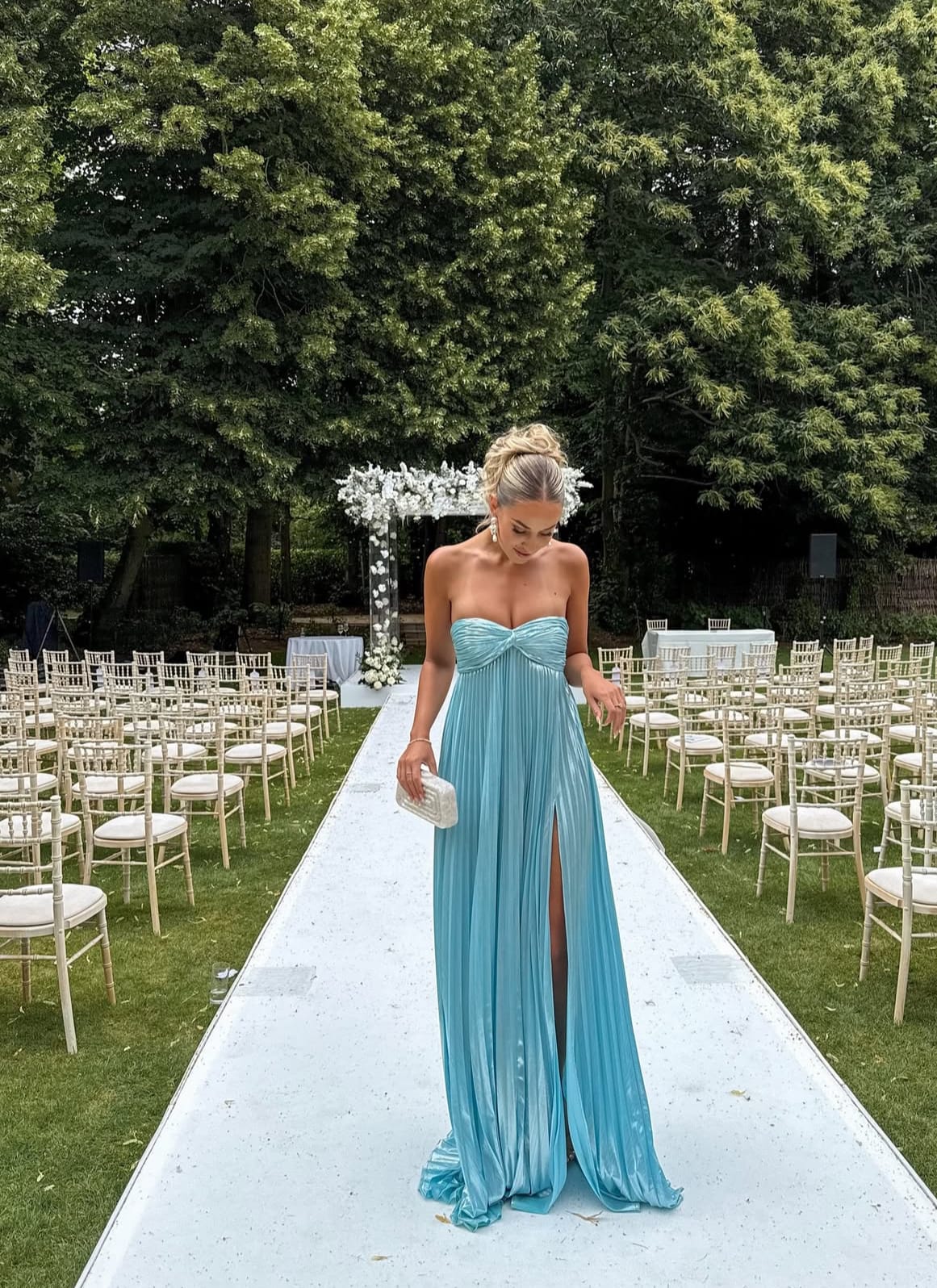 At the heart of this look is a captivating strapless gown in a radiant shade of soft aqua blue. The dress immediately evokes the serenity of calm ocean waves, with delicate pleats cascading gracefully from a beautifully twisted sweetheart neckline. The silky fabric flows effortlessly to the floor, its subtle sheen catching the light to create an ethereal glow. Adding a sophisticated edge, a thigh-high slit tastefully introduces a touch of allure to the soft, flowing silhouette.