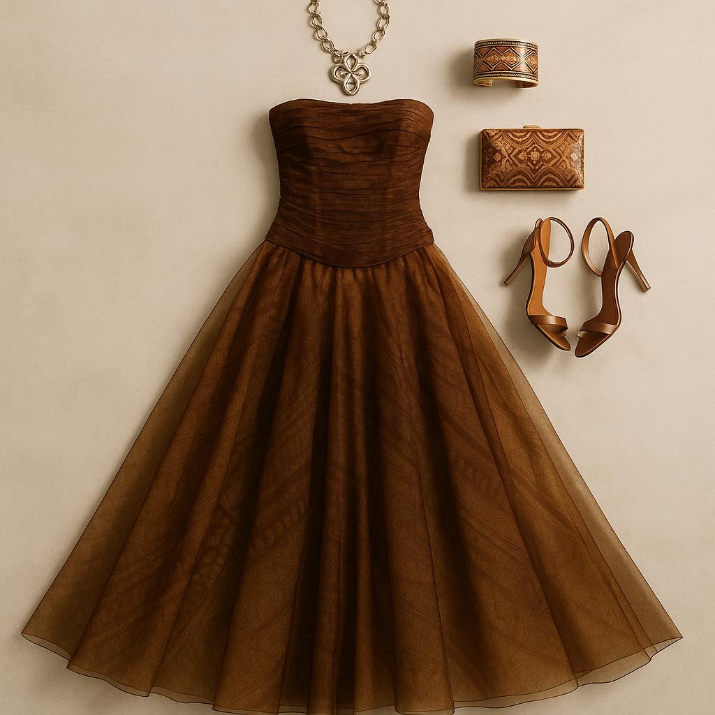 "Flat lay photograph of an elegant fashion ensemble inspired by a strapless brown ball gown. Center the flowing tulle skirt with sheer texture and subtle lace like patterns spread beautifully across the frame. Include a fitted strapless bodice at the top of the dress, maintaining a rich earthy brown tone. Arrange accessories around the dress: a chunky statement necklace in sculptural metallic gold, two bold carved cuff bracelets with tribal inspired detailing, a small structured clutch in matching brown with intricate engraved motifs, and a pair of minimal high heeled sandals in chocolate brown leather. Use a clean neutral background in warm beige to enhance the luxurious tones. "