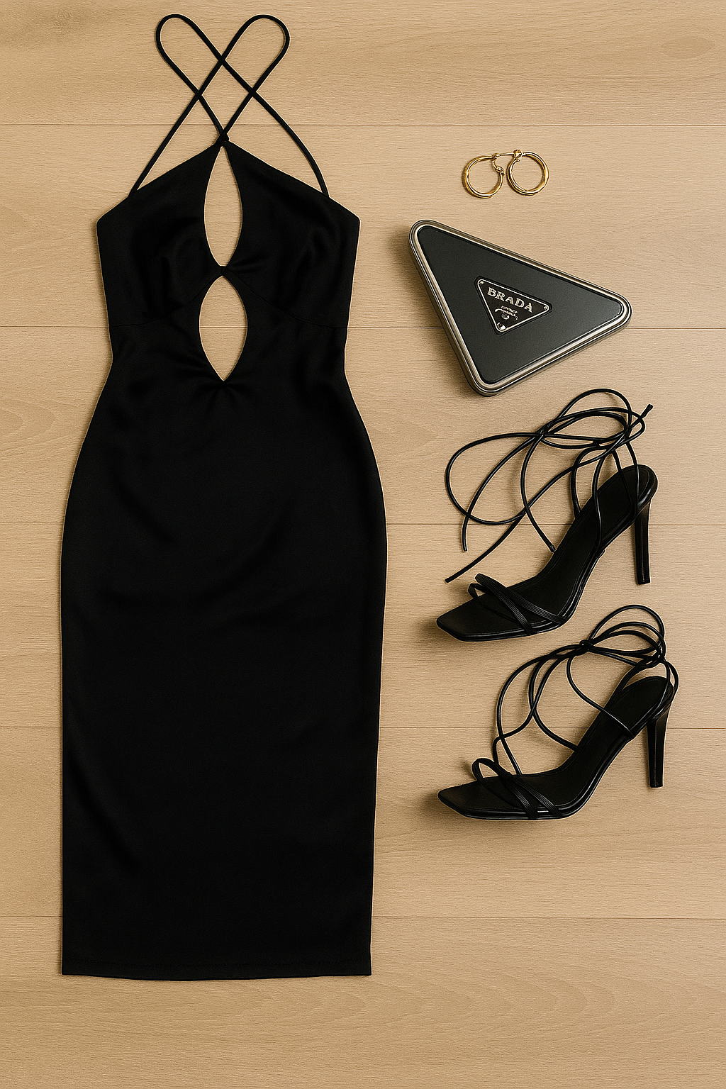 “A flat lay of a sleek black satin halter dress with double teardrop cutouts, arranged on a light wooden floor. Paired with strappy black stiletto heels, a black triangular Prada clutch, and gold hoop earrings. The items are neatly spaced, evenly lit with soft shadows, and photographed from a top-down view. No hands, no models, just the outfit and accessories”
