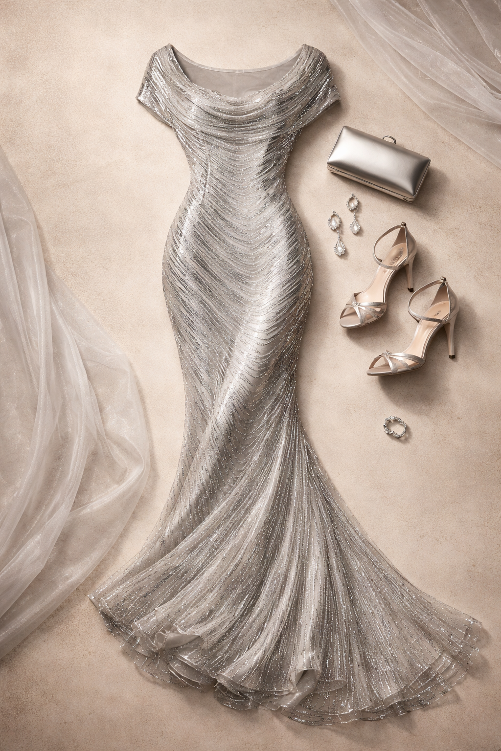 "A high fashion flatlay of an evening gown ensemble inspired by metallic silver elegance. The dress is arranged gracefully to highlight its fluid drape and sculpted silhouette, featuring fine metallic mesh texture with soft rippling lines and subtle shimmer. The hem is slightly fanned to emphasize movement and light reflection. Styled with minimalist silver strappy heels placed diagonally, delicate drop earrings in brushed silver, a sleek metallic clutch with soft curves, and a single sculptural ring. Optional sheer silver fabric is layered beneath parts of the gown to enhance depth and luminosity."
