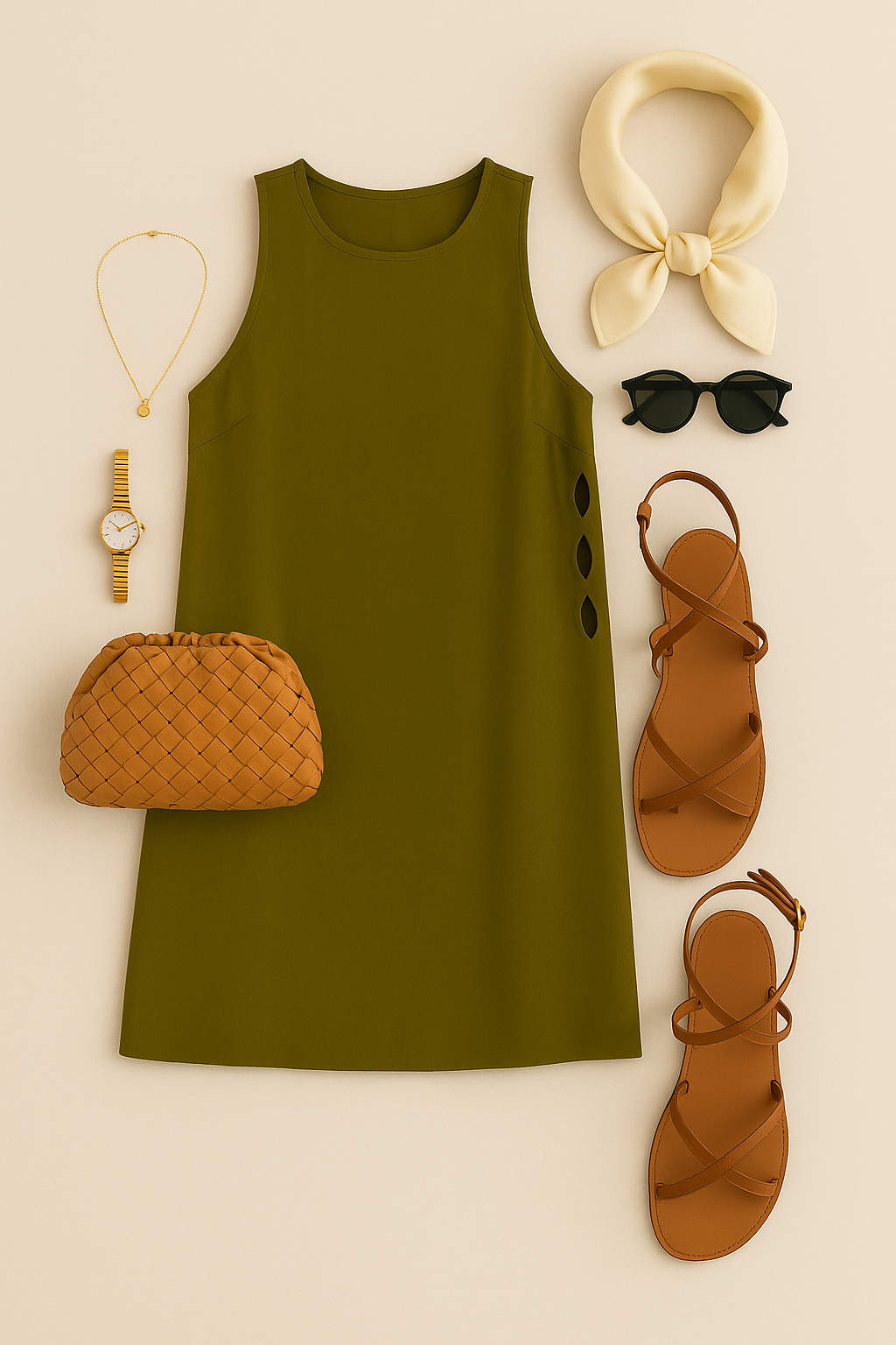 “Flat lay of a sleeveless olive green mini dress with three teardrop-shaped cutouts on both sides, paired with a cream headscarf, black round sunglasses, a gold watch, a delicate gold necklace, a tan woven clutch, and brown strappy flat sandals — all arranged neatly on a warm beige background in a clean, editorial layout.”