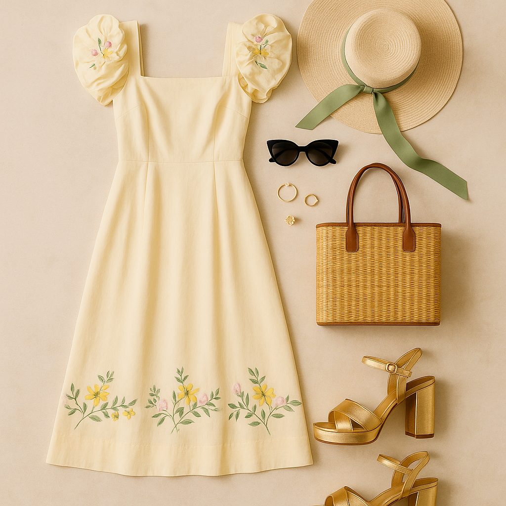 “A pastel yellow midi dress with puffed embroidered sleeves, a wide-brim straw hat with a green ribbon, gold platform heels, a structured woven tote with leather accents, oversized black cat-eye sunglasses, and delicate gold jewelry all arranged in a flat lay on a warm, neutral background with soft natural lighting”
