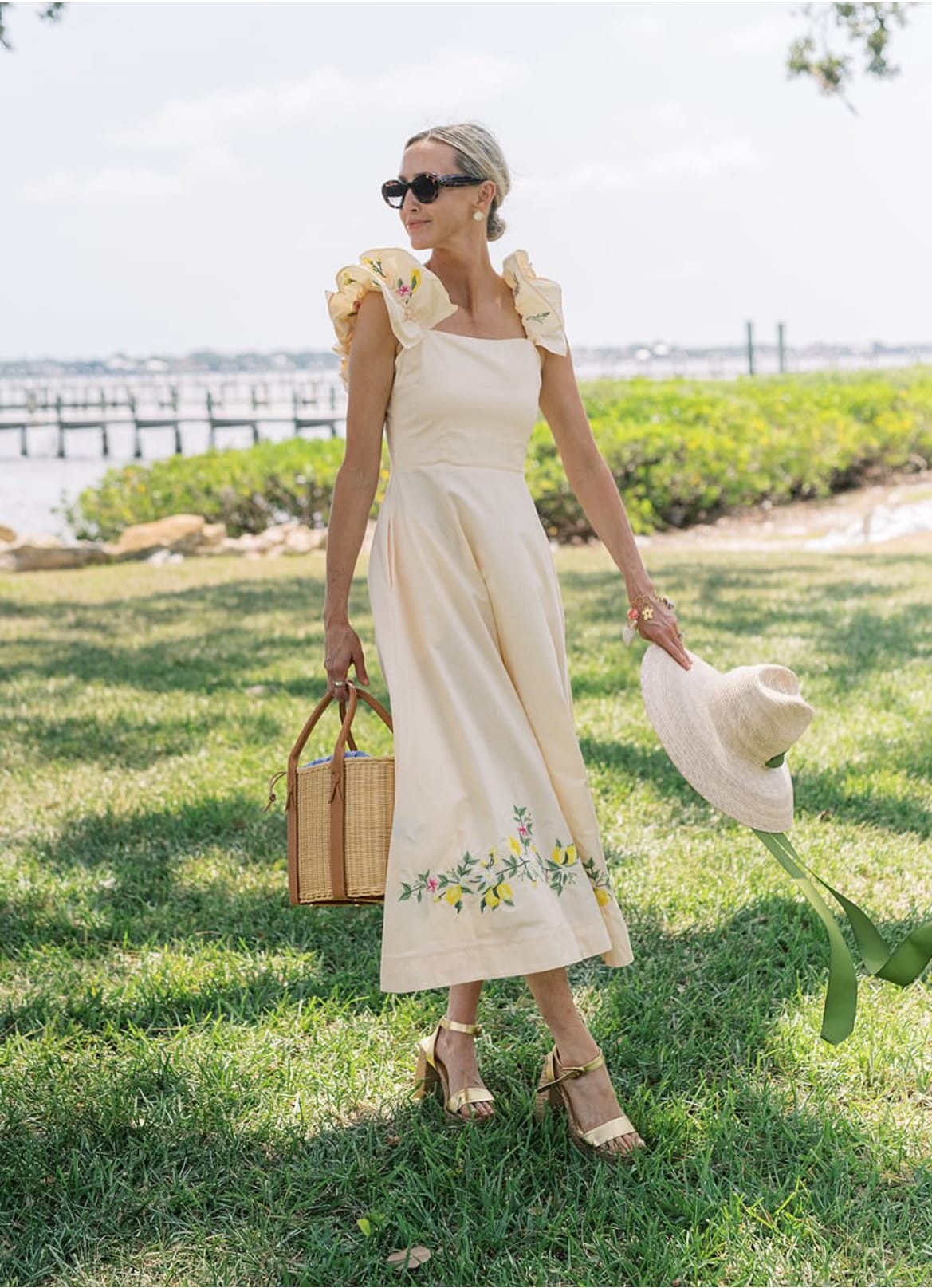 There’s something impossibly serene about this look, a soft breeze captured in fabric, femininity embroidered with intention. Sarah Tucker wears a dress that doesn’t just nod to spring—it sings it, softly and stylishly.
