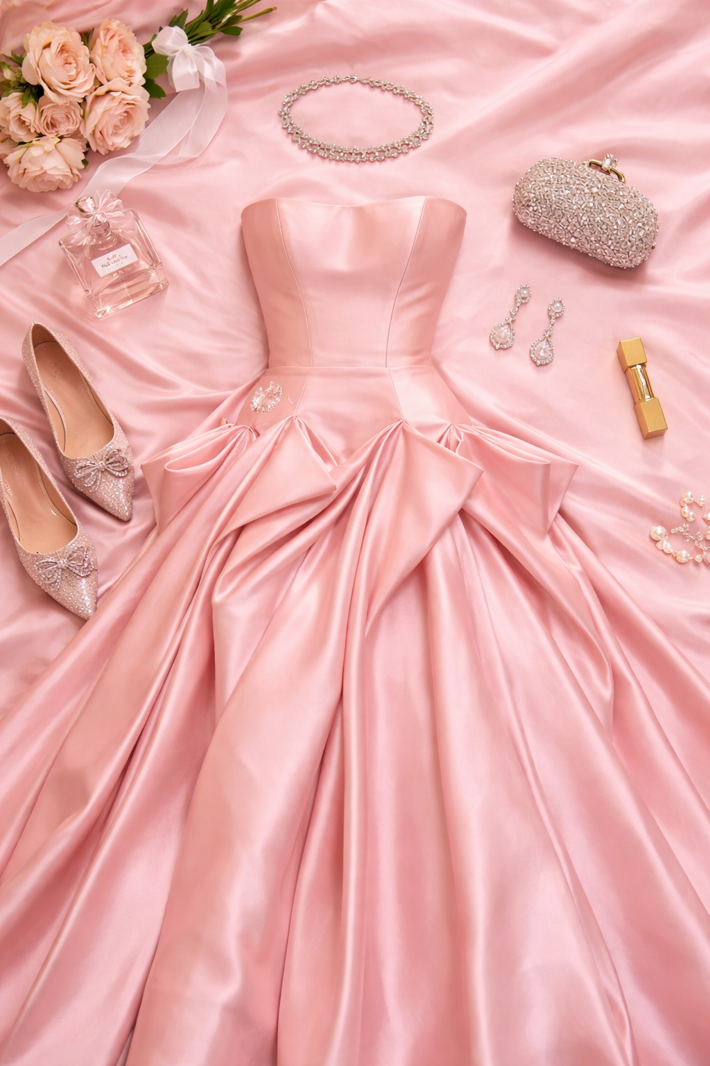 "Luxury fashion flatlay of a blush pink strapless satin ball gown arranged gracefully on a soft flowing satin background in the same tone. Surround the gown with refined evening accessories placed with balanced spacing: sparkling blush stiletto heels, a delicate diamond choker necklace, crystal drop earrings, an embellished crystal clutch, a soft bouquet of pale roses with silk ribbon, an elegant perfume bottle, and subtle pearl hairpins."