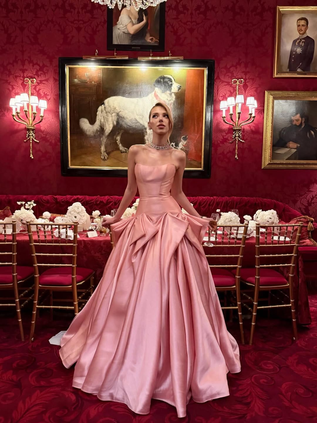 Color psychology quietly reinforces the narrative. Blush pink often carries associations of romance, yet within this richly toned interior it feels mature and self assured. The shade becomes a symbol of calm authority, standing steady amid deep reds and antique golds. This transformation from softness to strength mirrors the structural journey of the gown itself, fitted discipline above and expansive grace below.