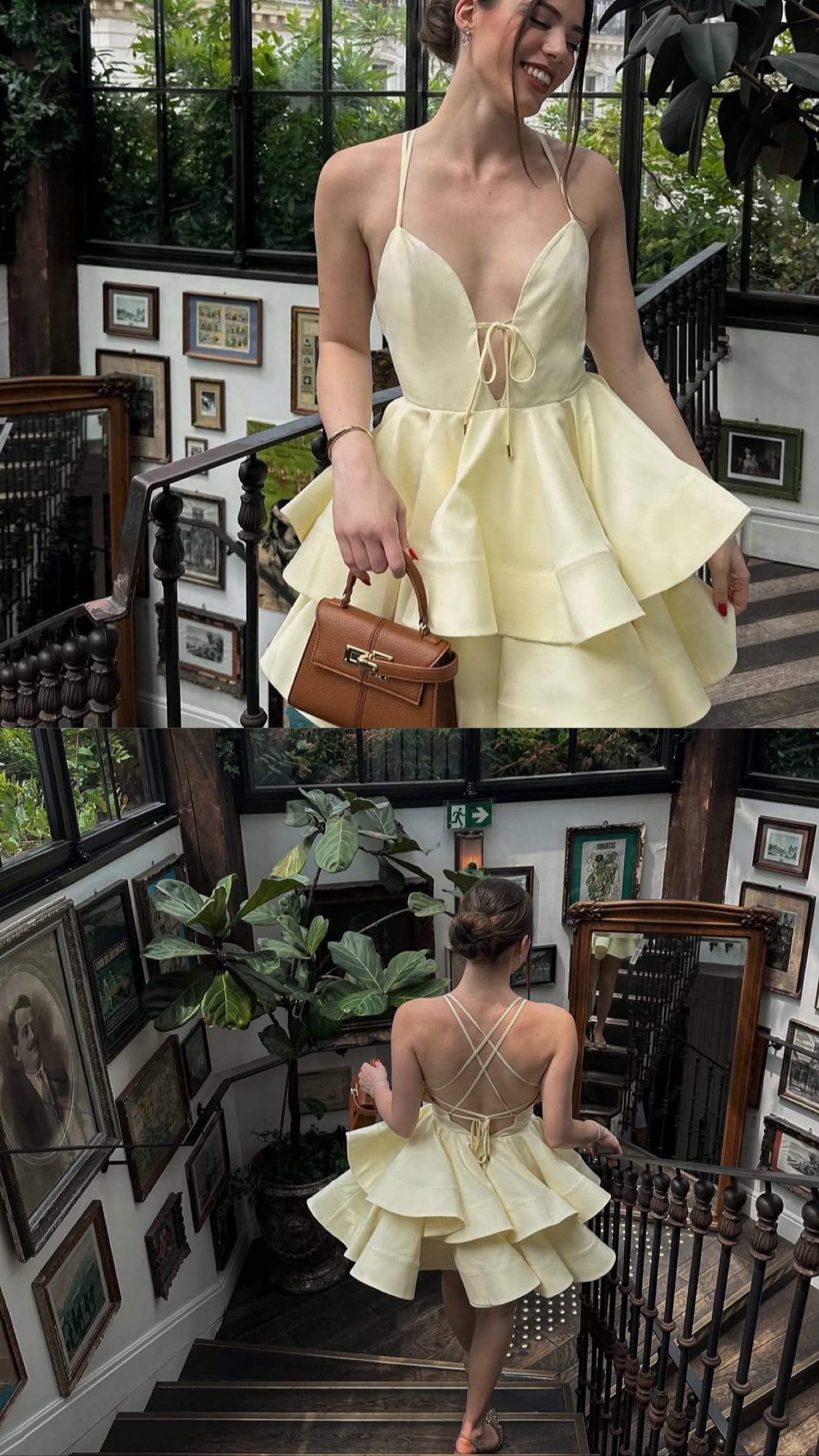 Rendered in a soft, buttery yellow, the dress feels like bottled sunlight — light, cheerful, and quietly decadent. Its fabric has just enough body to hold structure, allowing each tiered ruffle to float with precision, creating a sculptural movement that’s impossible to ignore. Every step turns into a gentle sway; every breeze becomes part of the performance.