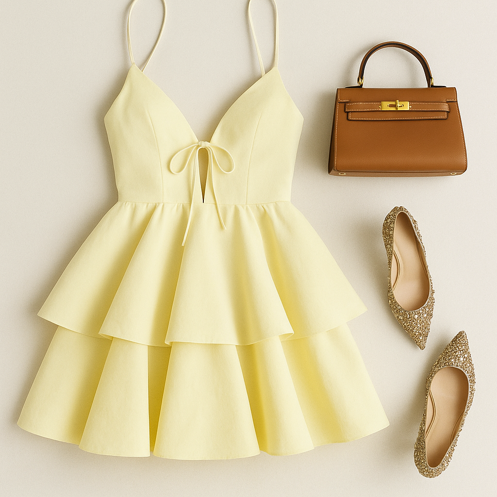 “A flat lay of a soft lemon-yellow tiered ruffle mini dress with spaghetti straps and a front tie detail, placed on a neutral light beige background. Next to the dress is a structured small brown leather handbag with a top handle and gold hardware, a pair of pointed-toe heels fully embellished with gold glitter crystals. The flat lay should be clean, elegant, and perfectly arranged to showcase each item clearly.No extra props, no shadows, just a minimalist luxury fashion flat lay.”