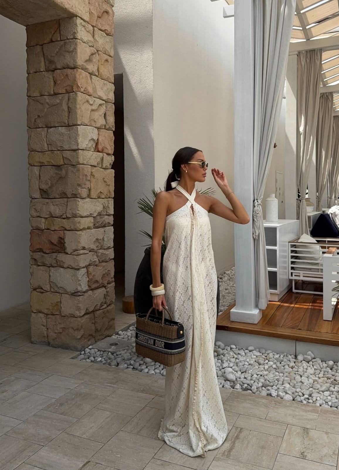 At the heart of the look is her dreamy ivory lace maxi dress—cut in a halter silhouette with an elegant criss-cross neckline. The fabric drapes with a soft weight, gliding along her figure before falling into a gentle train that brushes the tiles beneath her feet. It’s romantic yet minimal, intricate without being loud—perfectly balancing femininity with ease. The delicate lace allows just the right amount of sun to filter through, giving it a breezy transparency ideal for sipping champagne by the cabana or strolling barefoot along stone pathways.