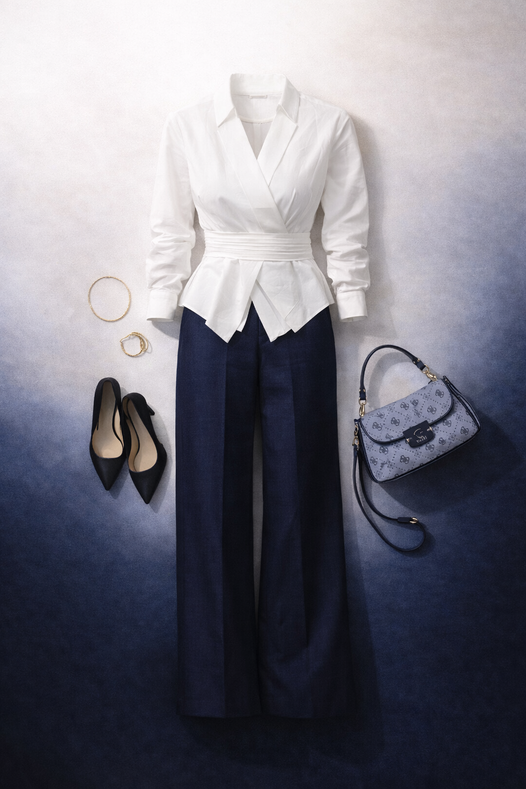 "High fashion flat lay photography of a crisp white structured wrap blouse with a cinched waist detail, paired with high waisted navy wide leg trousers. Arrange the outfit neatly centered on a soft gradient background blending white into deep navy blue. Include black pointed toe heels, delicate gold jewelry such as a slim necklace and bracelet, and a structured navy patterned handbag placed symmetrically beside the clothing. Clean, minimal composition."