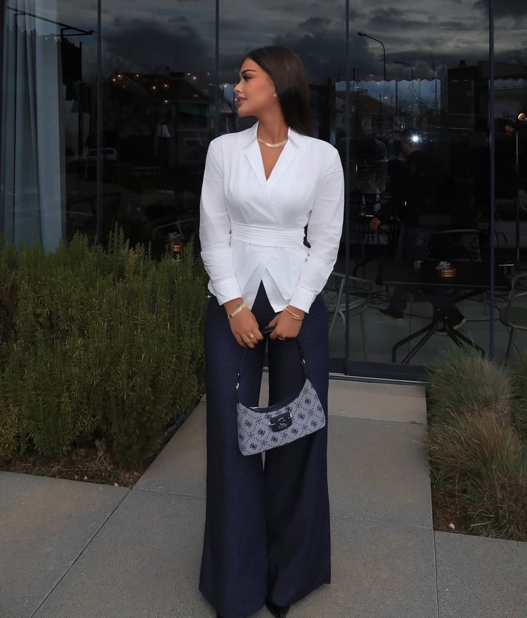 The foundation of the outfit is a crisp white blouse that feels architectural in its construction. The wrap style neckline creates a subtle V shape that frames the collarbone beautifully without plunging too deeply. The tailoring through the waist is deliberate. It cinches and defines, creating an hourglass silhouette while maintaining a refined edge. The fabric appears structured yet soft enough to move naturally, giving the top both authority and grace.