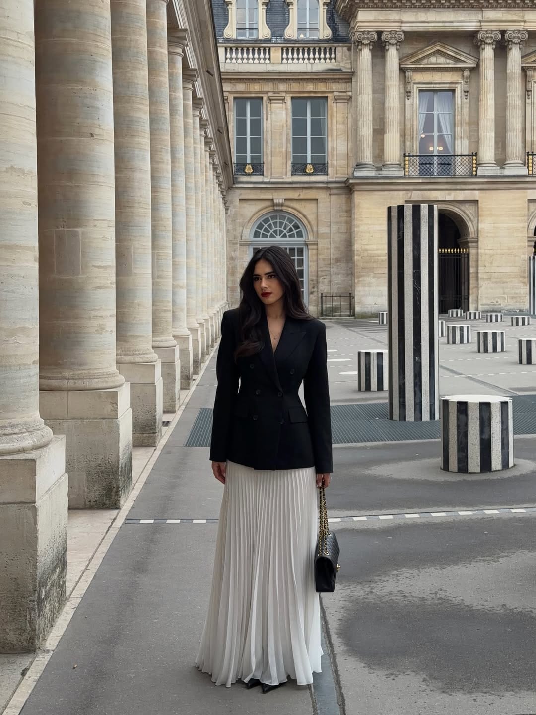Below, the white pleated maxi skirt introduces ethereal lightness, its accordion folds cascading from a high waistline that aligns seamlessly with the blazer's hem for balanced proportions. Likely crafted from chiffon or lightweight georgette, the fabric carries a translucent quality that catches the breeze, allowing subtle play of light and shadow through the pleats. The skirt's length sweeps to the ankles, pooling just enough to elongate the figure while maintaining practicality for city strolling, and its pristine white tone contrasts starkly with the blazer, evoking purity against sophistication.