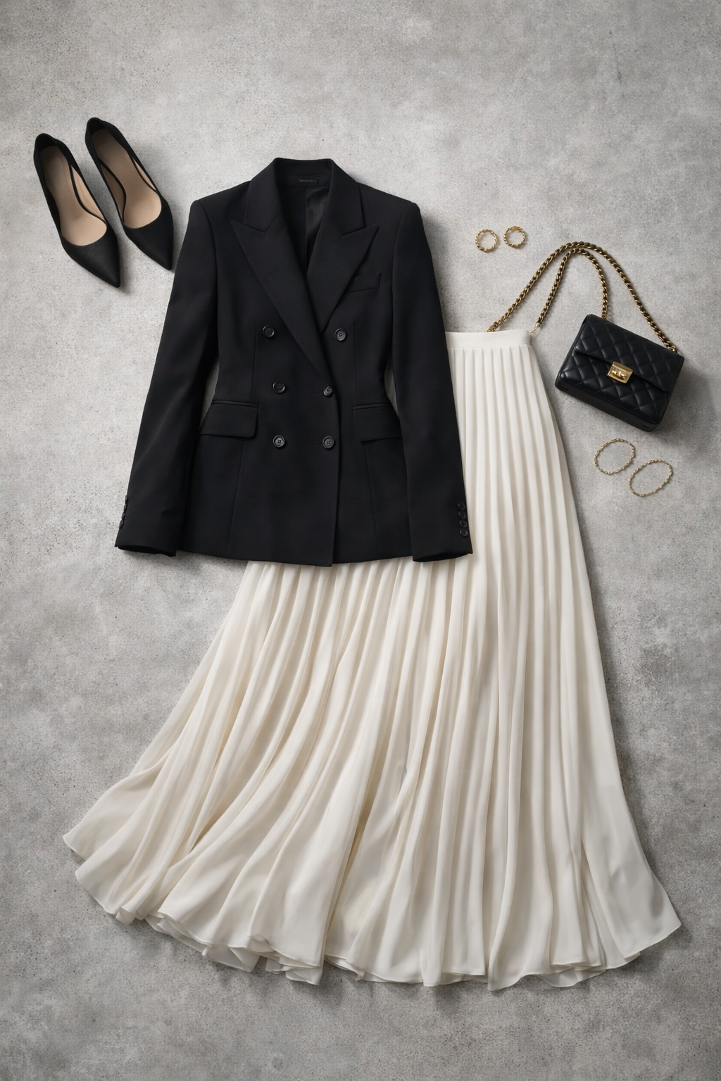 "Top-down flatlay of a chic monochrome outfit on a light grey concrete or stone-textured background. Outfit includes a structured black double-breasted tailored blazer with sharp lapels, paired with a flowing white pleated maxi skirt with soft draping. Arrange pieces symmetrically in a fashion editorial layout. Add accessories: black pointed-toe heels, quilted black handbag with gold chain strap, minimal gold hoop earrings, gold bracelet placed neatly around the outfit."