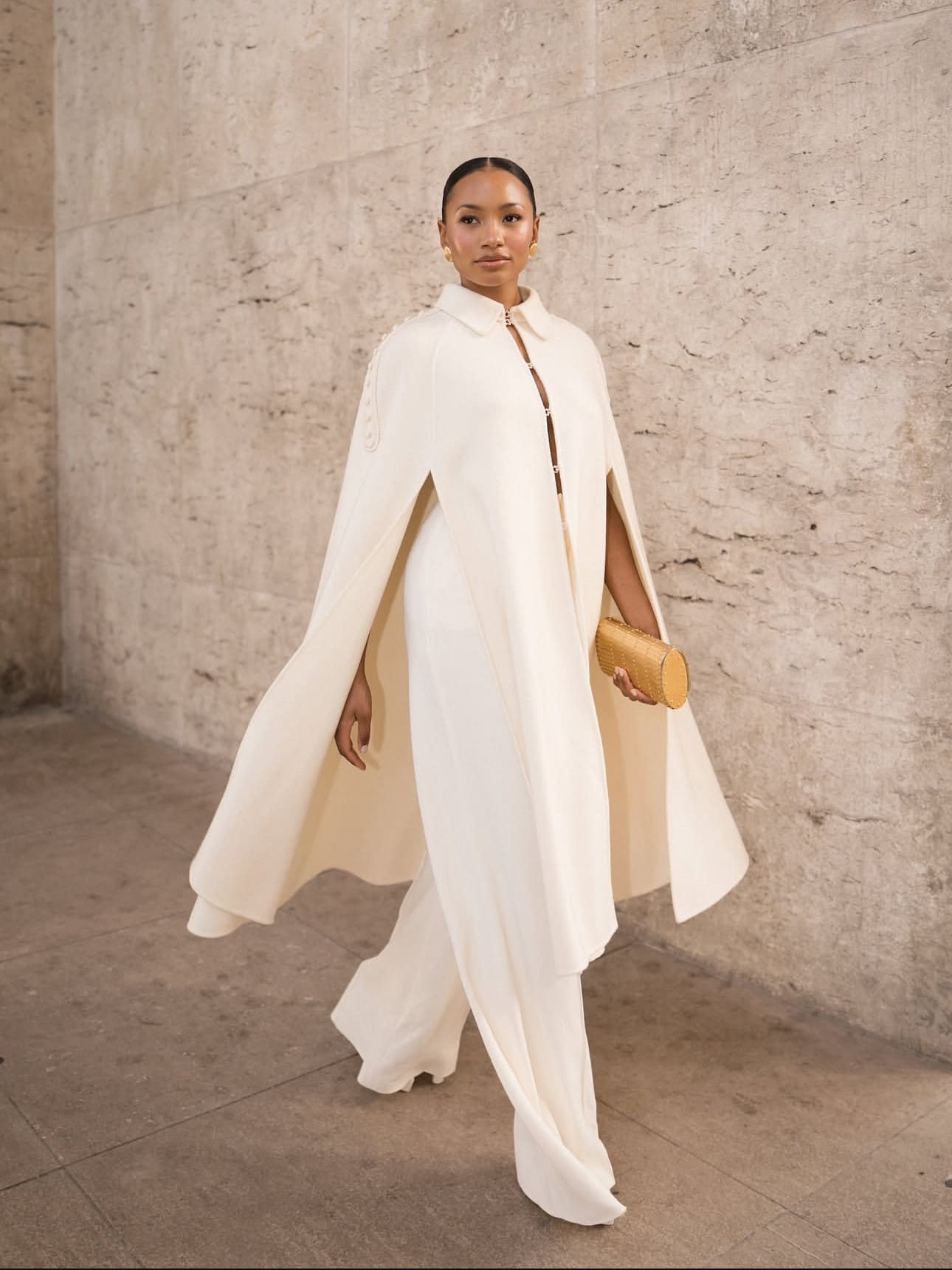 The wide-leg trousers beneath the cape are tailored to perfection. Their gentle flow mirrors the rhythm of the cape, allowing every step to feel measured and intentional. Together, they form a silhouette that celebrates stillness and strength. The all-ivory tone elevates the composition, emphasizing elegance through simplicity.