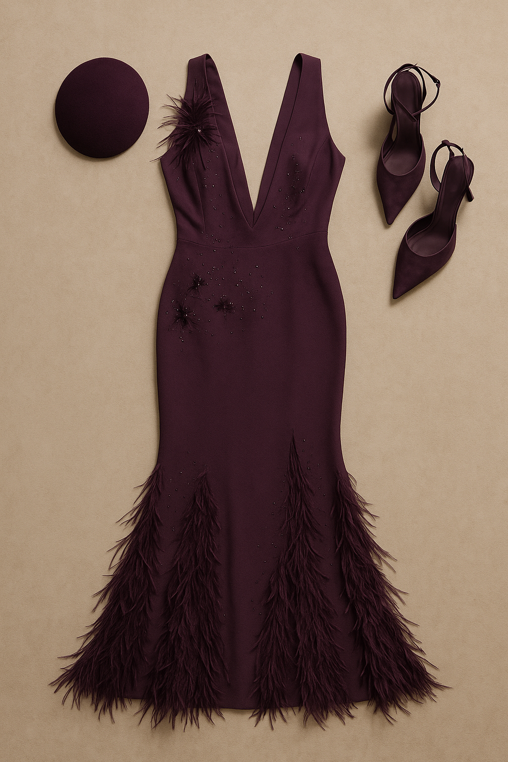 “Create a high fashion flatlay of an elegant plum evening gown inspired by Aimee. The dress should feature a deep plunging V neckline, a fitted silhouette, subtle beaded embellishments across the bodice, and feather detailing concentrated at the hem. Lay the gown vertically to emphasize its elongated shape and dramatic finish. Use a warm neutral background such as soft beige, champagne, or light stone to contrast with the rich plum fabric. “