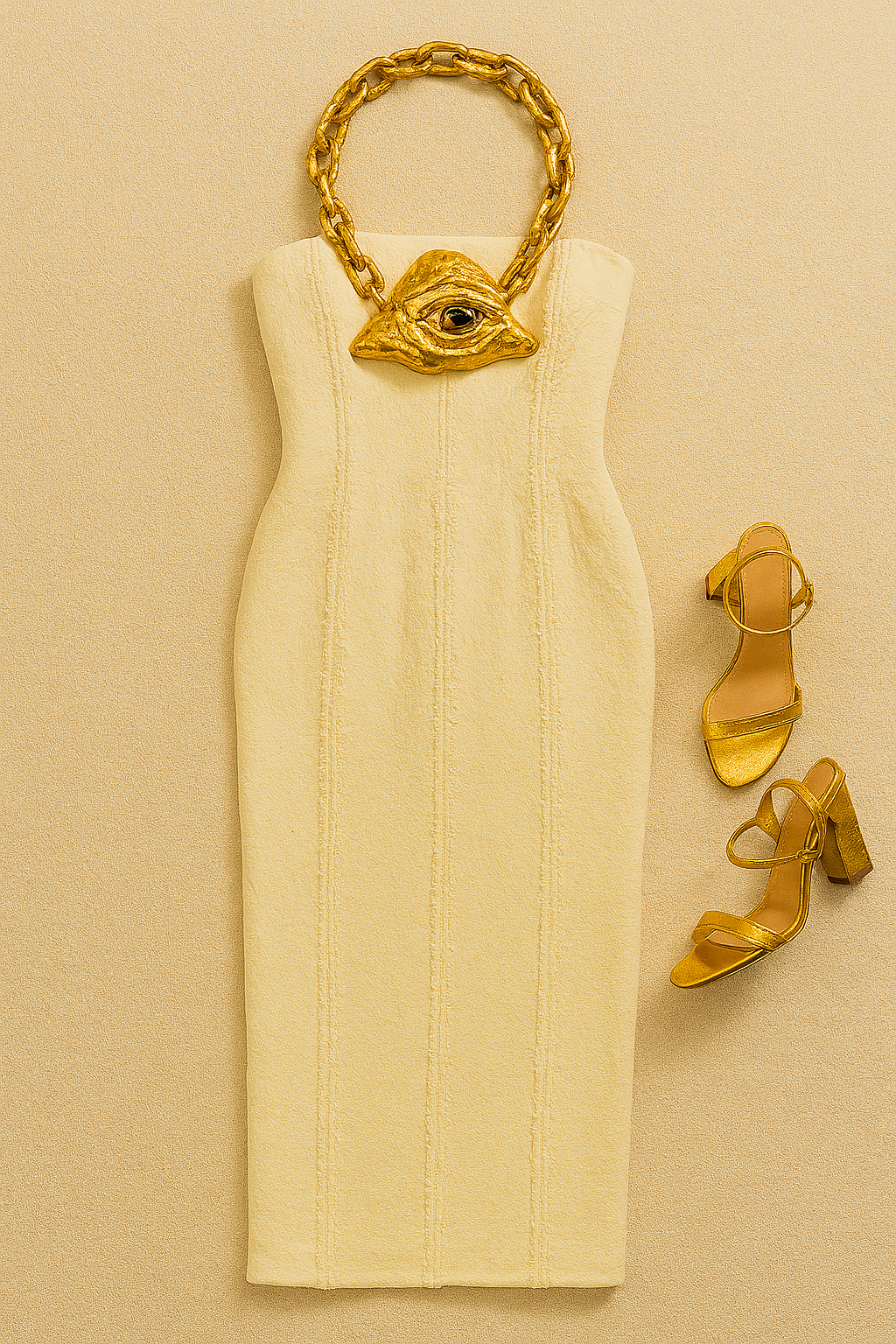 “A flat lay of an elegant off-white strapless midi dress with visible vertical frayed seams, styled with a large gold sculptural eye detail at the bust and a chunky gold chain around the neckline. Placed beside the dress are a pair of gold strappy block-heel sandals. The background is a soft, textured beige fabric. Lighting is warm and even, showcasing the textures and rich tones of the ensemble. No models, no shadows, no flat-lay props, just the outfit alone, centered and clean”