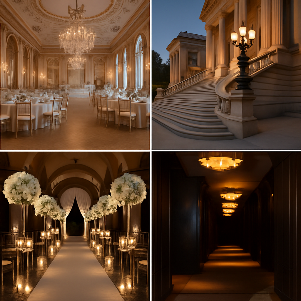 Her accessories remain minimal and luxurious. Sparkling earrings add just enough brilliance to frame her face without diverting attention from the gown’s sculptural elements. A refined bracelet sits on her wrist, chosen with restraint and intention. These pieces elevate the ensemble while preserving its quiet sophistication. Her makeup follows the same philosophy, focusing on luminous skin, defined eyes, and a balanced lip shade that harmonizes with the warm light of the corridor.