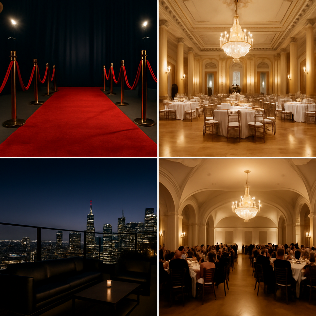 Luxury Galas– Grand spaces with chandeliers, polished floors, and formality to match the outfit’s refinement.