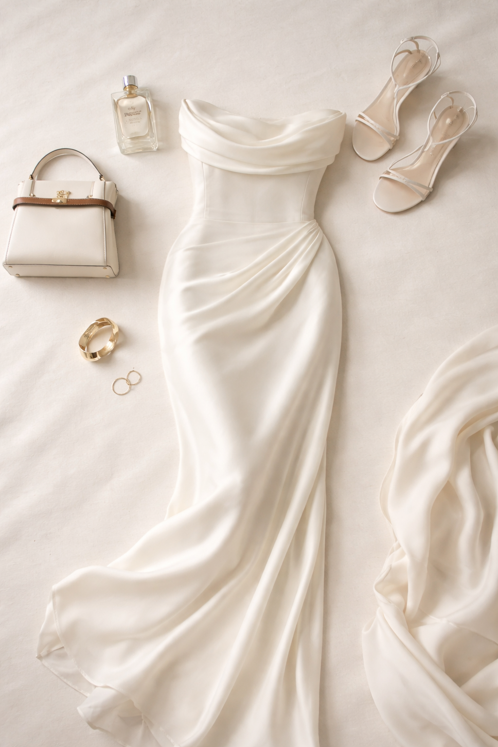 "Create a high end editorial flatlay of a minimalist ivory evening ensemble arranged on a soft cream fabric background. The central focus should be a sculptural off shoulder satin gown in flowing ivory with elegant draping and a gently fitted waist that communicates quiet luxury and refined femininity. Surround the dress with carefully spaced neutral accessories that feel intentional and calm, including delicate gold jewelry, elegant ivory or nude strappy heels, a small structured cream handbag, and a minimalist glass perfume bottle. A soft silk fabric should subtly flow into the composition to enhance movement and texture without overwhelming the scene. "