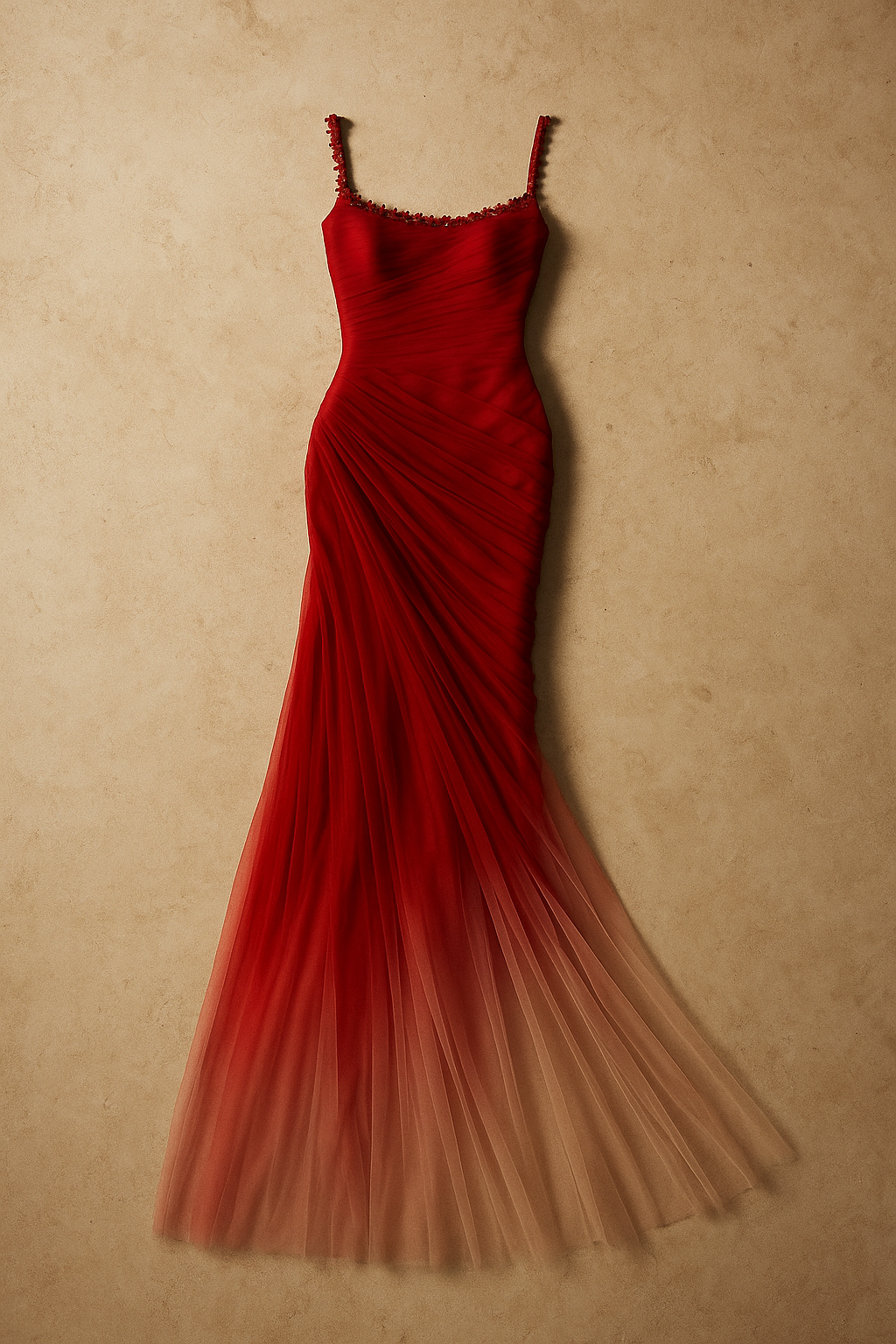 "Create a flat lay fashion composition of an elegant red ombré evening gown with delicate draping and a sheer, flowing tulle gown. The background should be a soft champagne stone texture similar to luxury event flooring. The dress should be arranged gracefully to showcase the silhouette and fade effect from deep red to soft blush. No accessories, no shoes, no jewelry, no clutch bags. High-end editorial lighting, dramatic shadows, refined and cinematic mood, photographed from above."