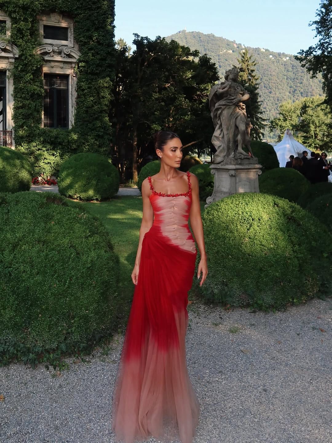 The moment the eye lands on the gown, the story begins. The design captivates instantly with a gradient that moves from a deep ruby into a soft nude blush, an ombré transition executed so flawlessly that it feels like watching embers cool into morning light. This color dialogue creates visual depth and an intoxicating sense of movement, even when she stands still. It is a masterclass in the emotional impact of color theory in luxury fashion.