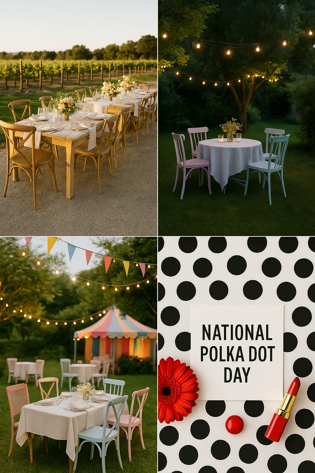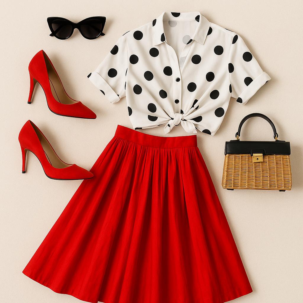 “Flat lay of a chic outfit on beige: white polka dot blouse (knotted), red pleated midi skirt, red heels, black cat-eye sunglasses, and a wicker handbag with black leather trim. Retro, bold, and elegant.”