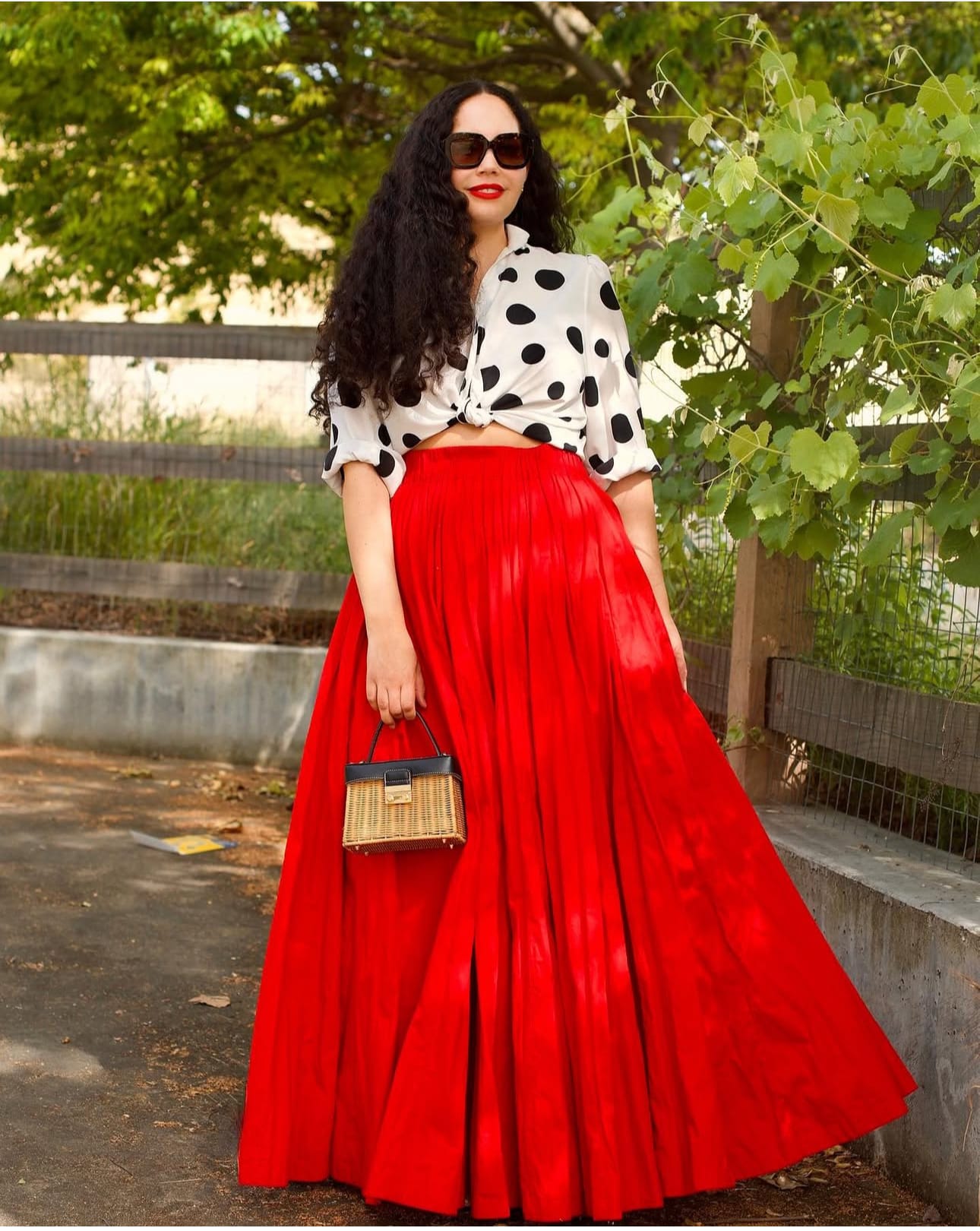 The red maxi skirt is nothing short of striking. Voluminous and rich, it flows like liquid confidence with every step. The pleats aren’t just decorative—they’re directional, guiding the eye and adding subtle movement that makes the whole look feel alive. It’s not trying to be dramatic—it simply is.
