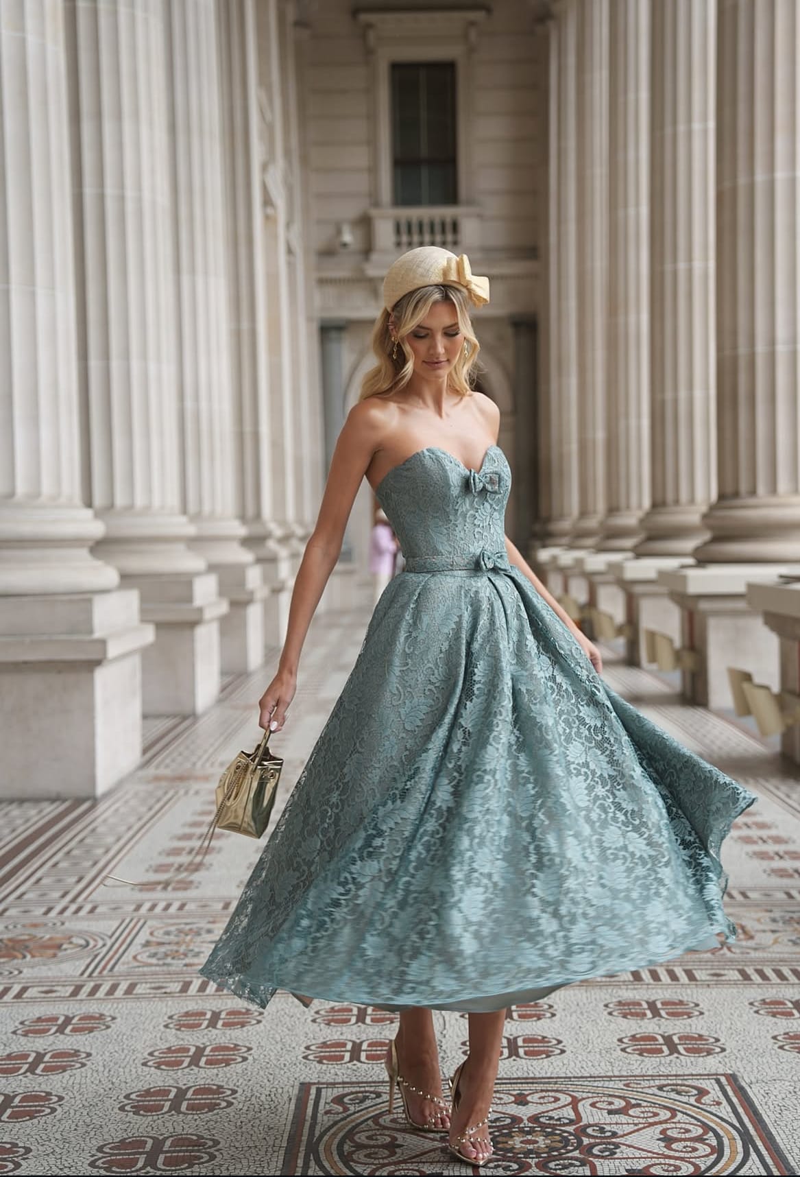 Her accessories amplify the vintage inspiration without overwhelming the dress. The ivory fascinator with a structured bow lends the elegance of race day millinery and frames her face with grace. The gold metallic handbag, sculpturally folded, introduces a striking contrast in both shape and finish. Its reflective surface complements the soft cool tones of the gown while signaling a luxurious punctuation to the look.