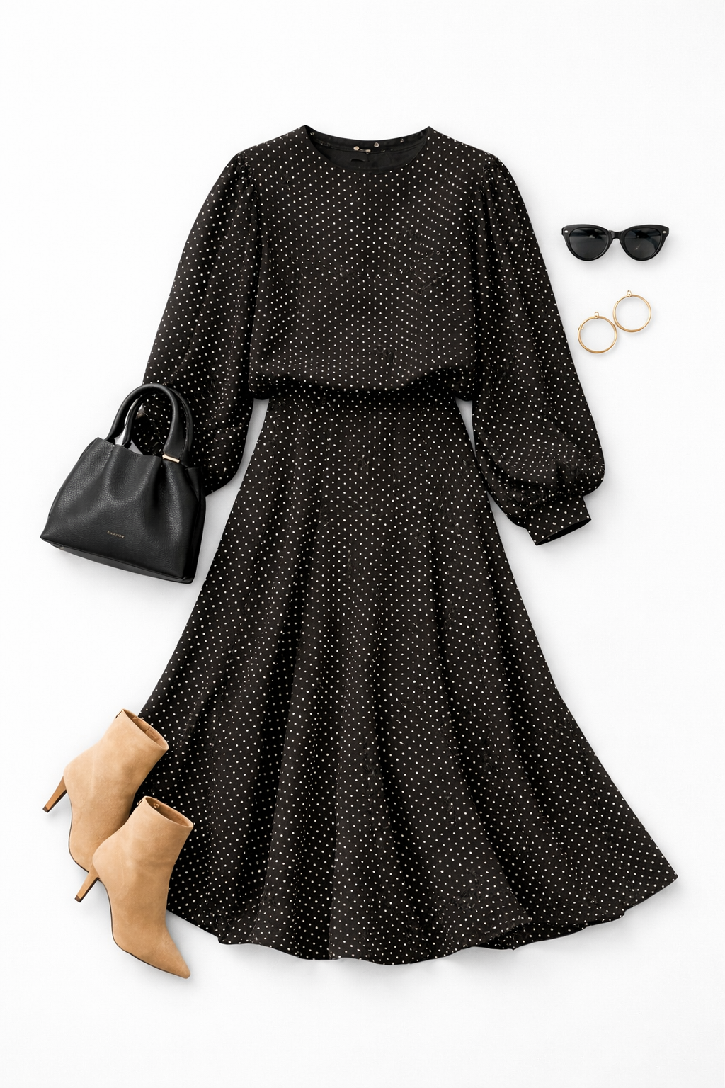 "Create a high end editorial flatlay of a modest black polka dot ensemble arranged on a clean soft white background with gentle natural shadows and diffused studio lighting. The central focus is a flowing midi dress with a high neckline, sheer voluminous sleeves, delicate micro polka dot pattern, and a softly flared skirt that conveys quiet elegance and movement. Surround the garment with refined minimalist accessories in coordinated neutral and black tones, including a structured black leather handbag, beige suede ankle boots with slender heels, classic black cat eye sunglasses, and simple gold hoop earrings."
