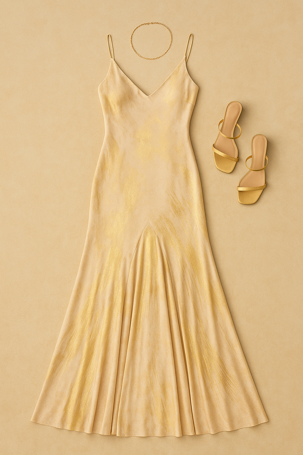 "Create a luxurious flatlay of a champagne gold evening gown inspired by Natalia Carvalho. The dress should be arranged neatly on a warm beige background to enhance visibility and match the sunlit aesthetic. Include thin spaghetti straps, a soft V neckline, and flowing panels that create a gentle flare at the hem. Add hand painted style gold brushstroke details throughout the fabric to reflect a warm metallic glow. Place golden heeled sandals to the right of the dress and a delicate gold chain necklace above it."