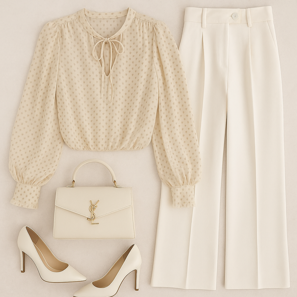 "Luxury flat lay of a cream sheer polka dot long sleeve blouse with ribbon tie neckline, wide leg tailored white trousers, cream Saint Laurent structured mini handbag with gold hardware, and cream pointed toe high heels, arranged neatly on a soft beige textured background in high end editorial style, natural soft lighting, clean minimal composition, quiet luxury aesthetic"