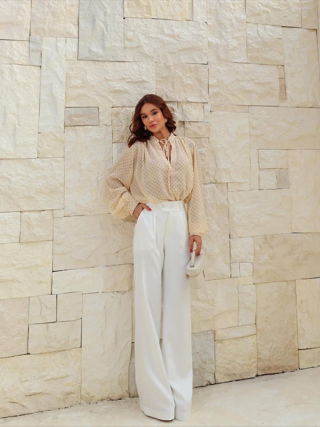 Balancing the softness of the blouse, the high waisted white wide leg trousers offer structure and architectural precision. The tailoring is impeccable. The raised waist visually lengthens the torso while the pressed pleats shape the hips with smooth definition. The wide leg silhouette falls in a long uninterrupted vertical line, elongating the legs and enhancing posture.
