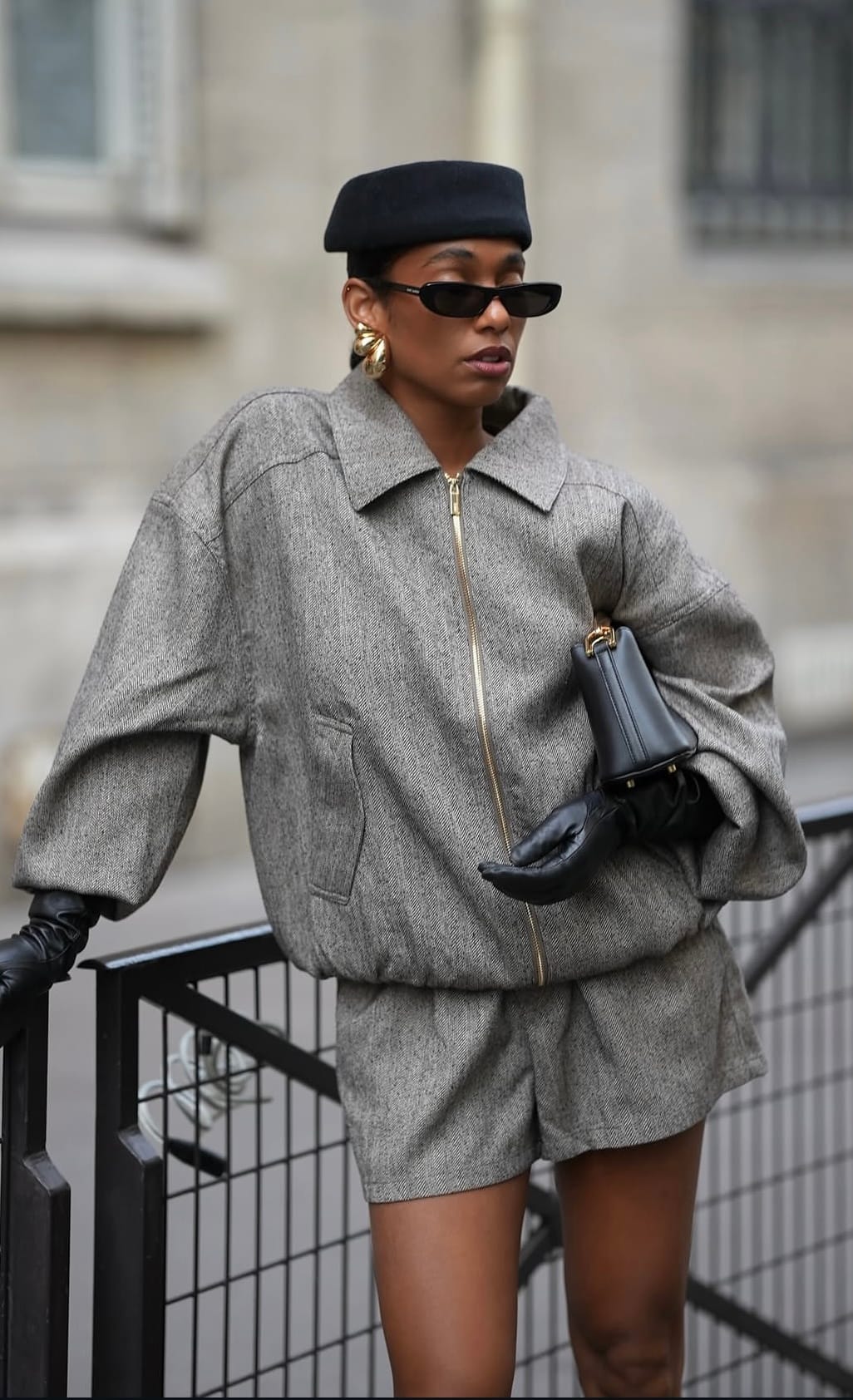 Her accessories are few but deliberate. The mini structured handbag, finished in polished black with gold accents, speaks the language of restraint. It complements the gloves and boots while echoing the hardware of her zipper. Her beret adds another layer of Parisian identity, softening the overall geometry of the look. The small black sunglasses and sculptural gold earrings bring refinement without disrupting the neutral palette. Every item serves a role, and together they form a cohesive visual statement rooted in simplicity and confidence.