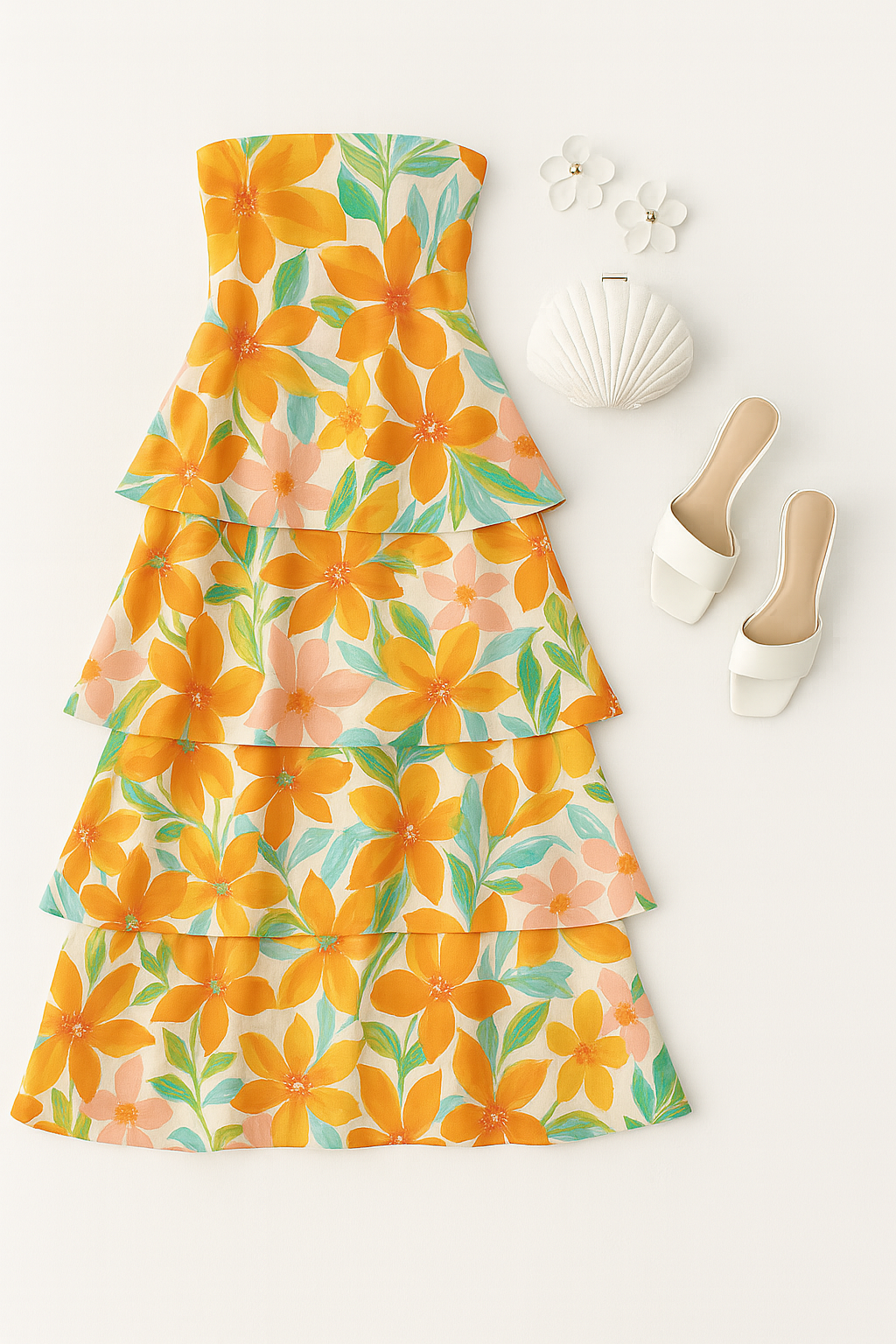 “Flat lay of a strapless, tiered maxi dress with a bright floral print in orange, pink, and green hues. The dress is paired with white heeled sandals, a shell-shaped white clutch, and two white flower earrings. All items are arranged neatly on a clean, off-white textured background with soft lighting, creating a fresh and elegant summer look”