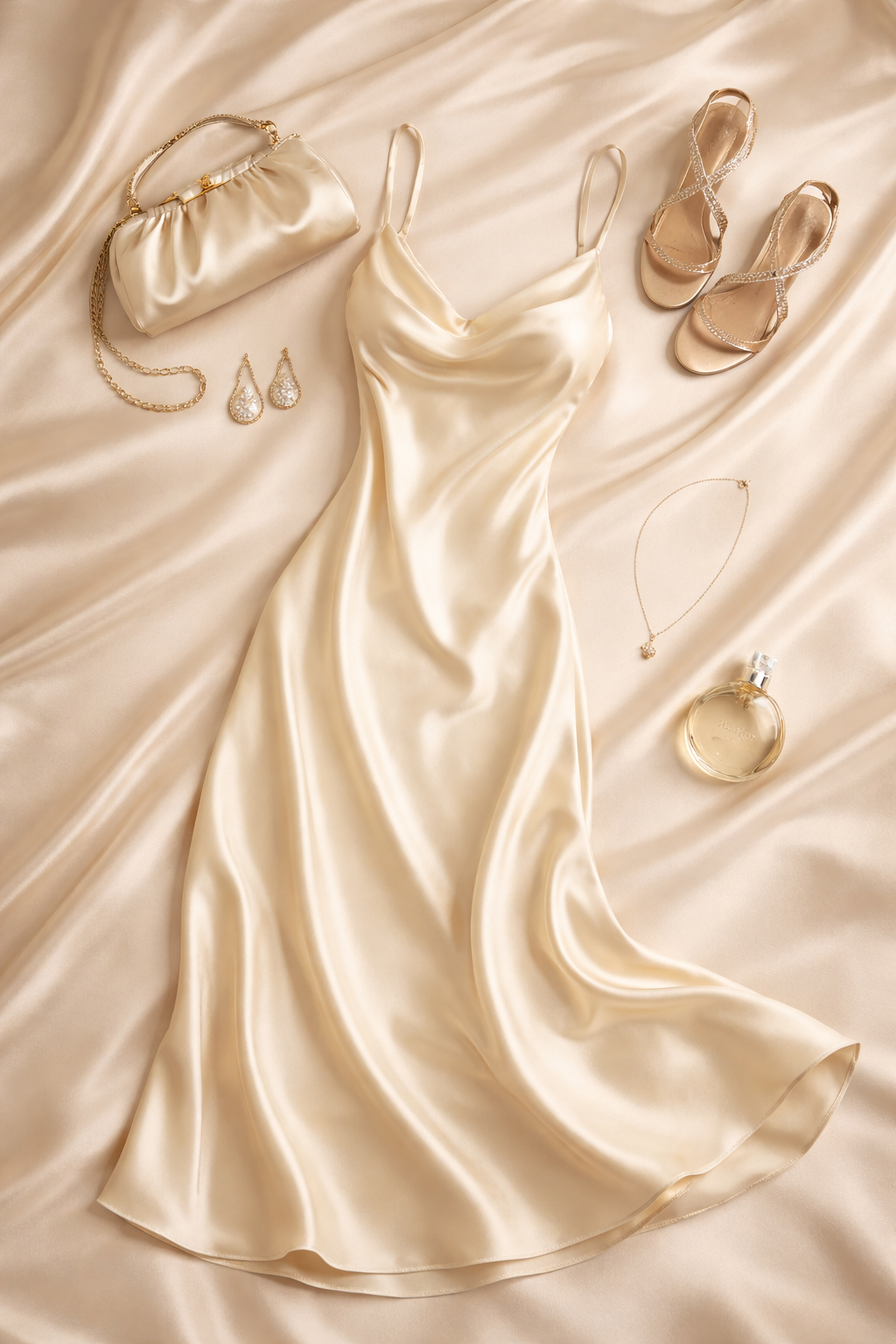 "Create a refined luxury fashion flatlay of a champagne satin slip dress arranged on a soft flowing satin backdrop in the same tonal palette, styled with elegant editorial balance and minimal sophistication, accompanied by coordinated accessories including delicate gold strappy heels, a ruched satin clutch, fine jewelry pieces, and a classic perfume bottle, all positioned with intentional spacing and graceful composition, illuminated by warm diffused studio lighting that enhances the silk texture, gentle highlights, and natural shadows, captured in ultra realistic detail with couture level finish, timeless magazine quality, no model, no text, no clutter, and full visual focus on the polished harmony of the ensemble."