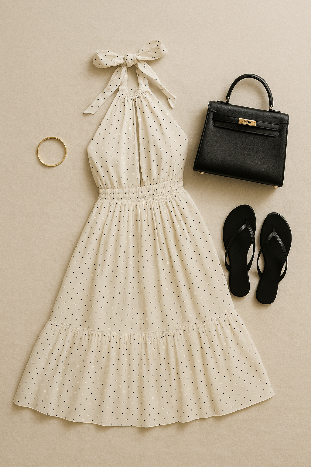 "Luxury flatlay of a white sleeveless halter polka dot midi dress with gathered waist and open back bow tie detail, arranged on a soft beige fabric background. Include a structured black leather handbag with gold hardware, white pointed toe heels, and a minimal gold bangle. Soft natural studio lighting, high end editorial fashion flatlay composition, quiet romantic aesthetic, refined and minimal luxury styling"