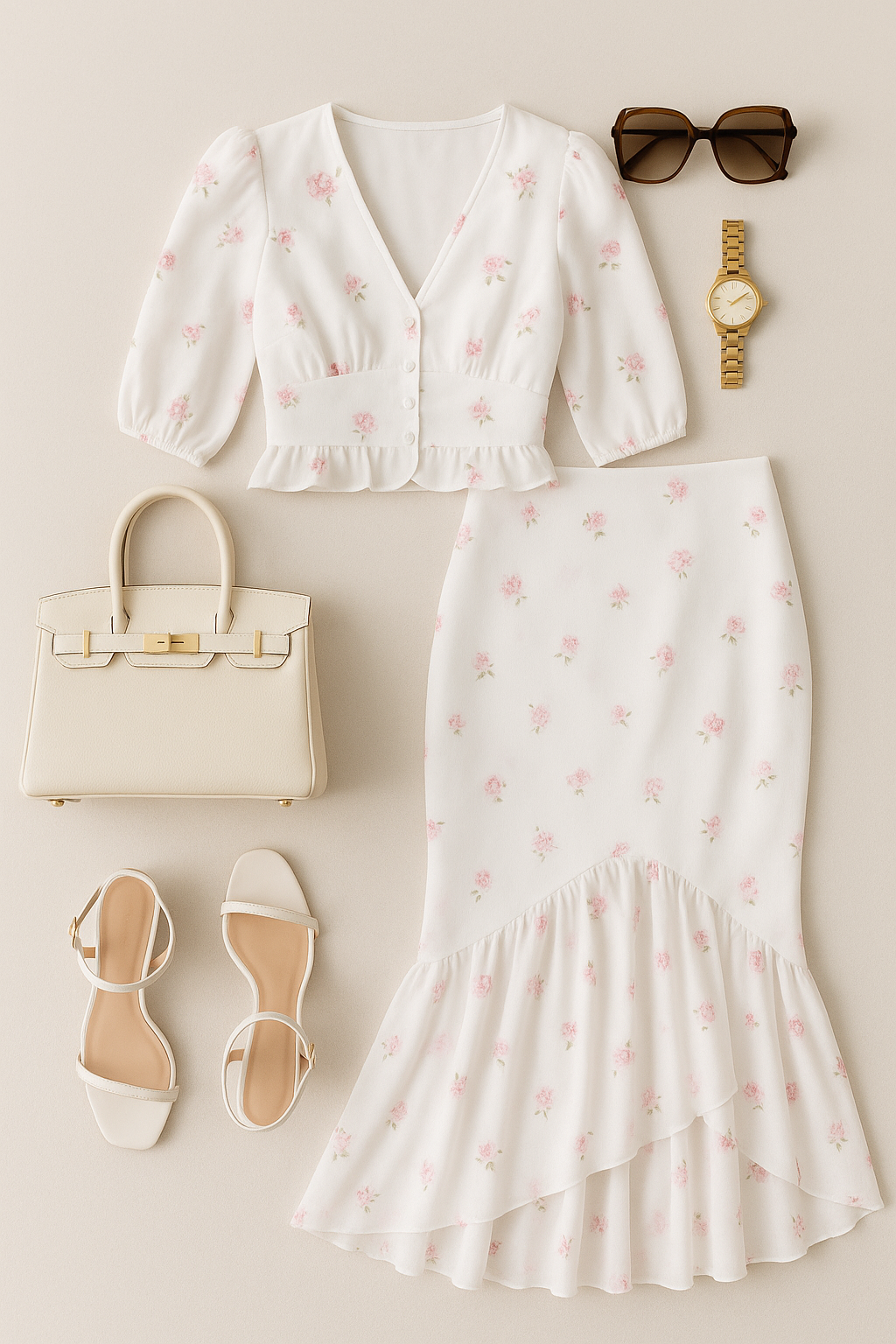 “A flat lay photograph featuring an elegant two-piece floral outfit. The top is a cropped blouse with a V-neckline, fitted bodice, soft peplum ruffle, and 3/4 length puff sleeves. The matching high-waisted skirt is fitted through the hips and flares into a tiered asymmetrical ruffle hem. The fabric is white with scattered soft pink rose prints. Accessories include a cream structured handbag with gold hardware, white strappy block-heeled sandals, a gold bracelet-style wristwatch, and oversized square brown sunglasses. The arrangement is set on a soft beige textured background, with balanced lighting to highlight the soft, feminine, and sophisticated aesthetic.”